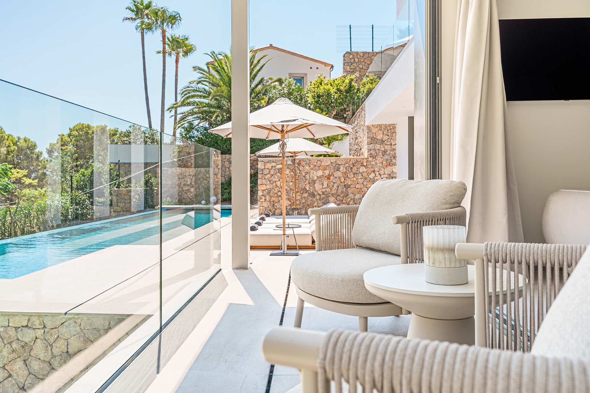Situada en una zona tranquila, se puede llegar en pocos minutos al popular puerto de Port d’Andratx con su exquisito paseo marítimo lleno de finos restaurantes, boutiques y cafés, mientras que a Palma se llega en sólo 30 minutos. Una propiedad excepcional para los amantes del lujo mediterráneo.