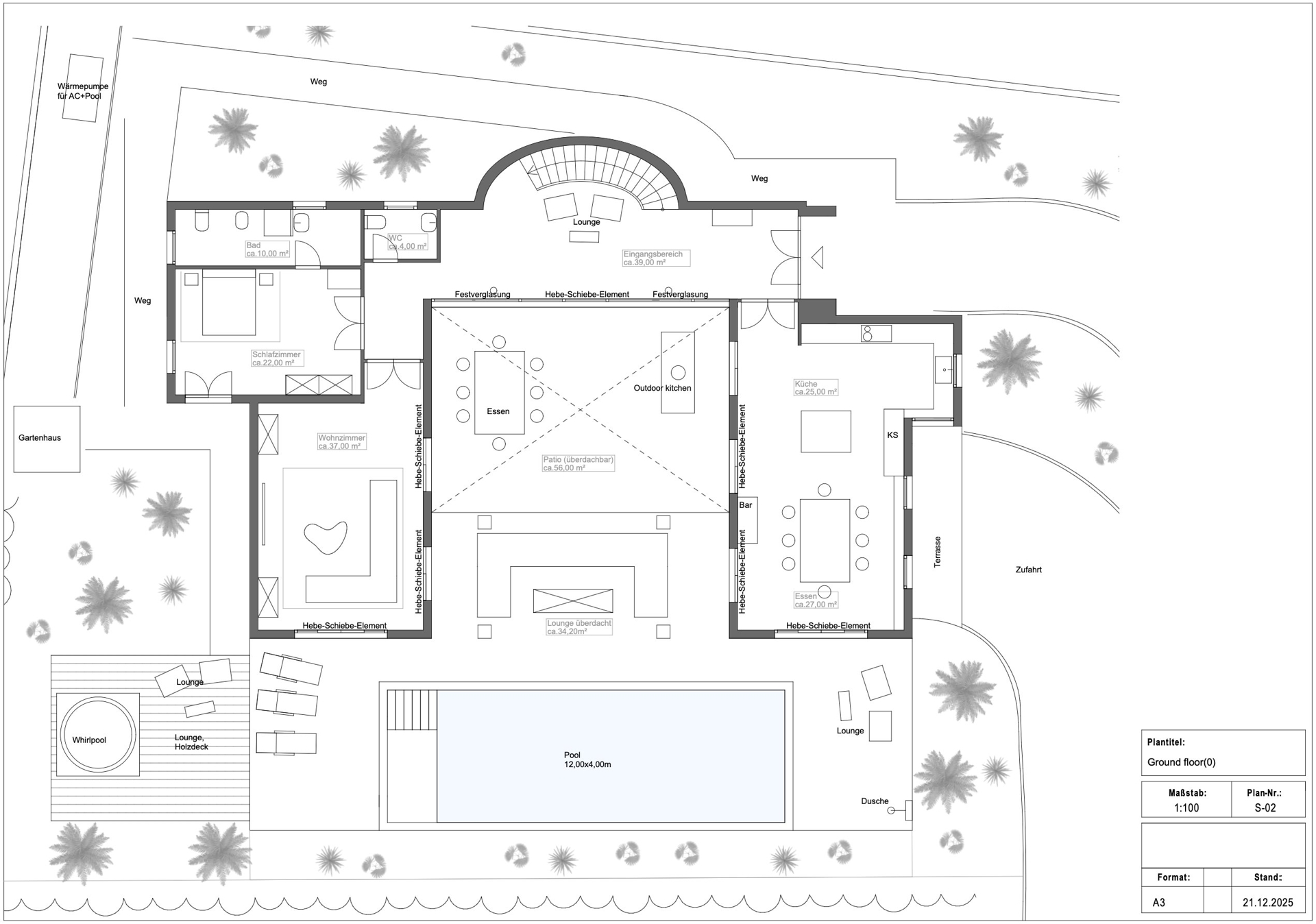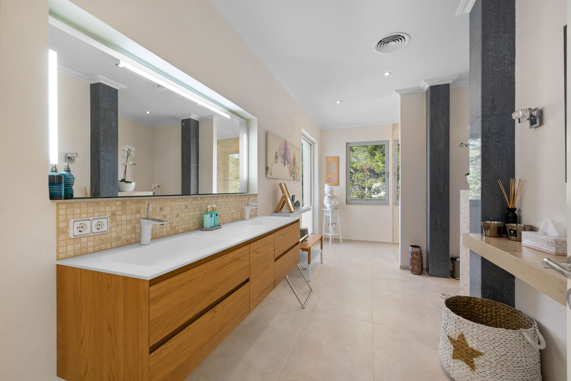 Auf rund 465 m² Wohnfläche entfaltet sich ein außergewöhnliches Raumkonzept mit einem großzügigen, flexibel überdachten Patio als Herzstück – ein beeindruckender Innenhof, der Innen- und Außenbereiche einzigartig miteinander verbindet. Der weitläufige Patio fungiert wie ein offenes Wohnzimmer unter freiem Himmel mit Lounge-Bereich, Barbecue-Zone, hochwertiger Outdoor-Küche, beheiztem Salzwasserpool und Whirlpool. Das Erdgeschoss umfasst eine Designküche, einen stilvollen Wohnbereich sowie ein elegantes Gästeschlafzimmer mit Bad en Suite.
