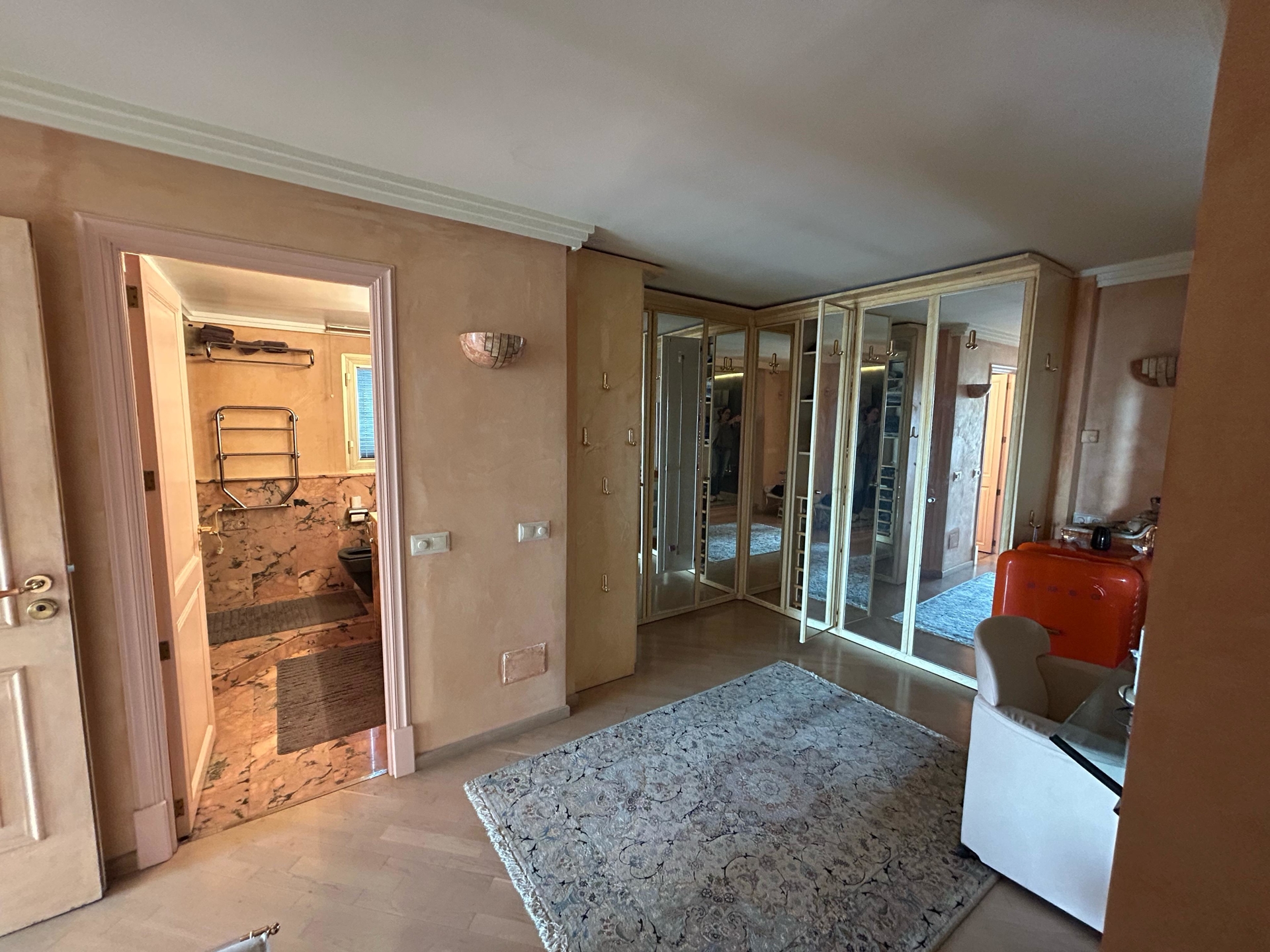 Das Penthouse verfügt über drei Schlafzimmer und zwei Bäder sowie ein separates Gäste-WC. Zwei der Schlafzimmer sind jeweils einem separaten Bereich zugeordnet und bieten mit eigenen Wohnnischen ein hohes Maß an Privatsphäre – ideal für Gäste, Kinder oder Arbeiten im Homeoffice. Alle Wohnräume sind mit Einbauschränken ausgestattet und klimatisiert. Die Böden bestehen aus Parkett und Laminat, die Fenster sind doppelt verglast.
